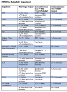 In March, President Biden submitted to Congress his budget for Fiscal Year 2023 (FY23). The budget included a total of $37.65 billion in discretionary resources for the Department of Justice, an increase of $2.63 billion over the 2022 enacted budget.