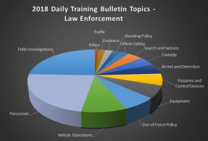 The 2018 summary report from Lexipol organizes training topics into 14 main categories and more than 150 subtopics. The top three main categories were Field Investigations, Personnel and Vehicle Operations. The top subtopics were:
