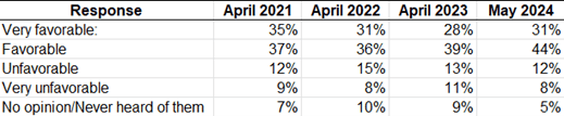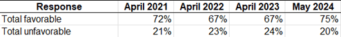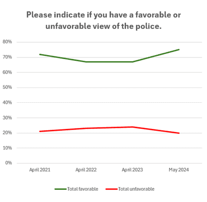 While the “very favorable” rating from May 2024 has not rebounded back to the level seen in April 2021, the substantial increase among “favorable” respondents was enough to boost overall positive views of police.