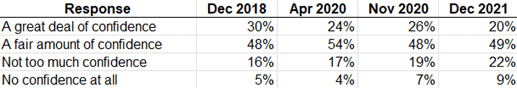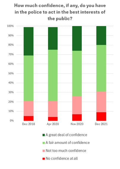 This data partially mirrors the trend seen in the Pew American Trends Panel online survey, which asked, “How much confidence, if any, do you have in the police to act in the best interests of the public?” In the December 2018 poll, 30% and 48% of respondents indicated “a great deal of confidence” and “a fair amount of confidence” respectively, for a total favorable rating of 78%. By December 2021, those numbers were at 20% and 49%, for an overall 69% favorable rating.